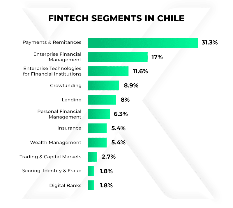 Fintech Radar, a survey conducted by Finnovista, shows that payment and remittances are the leading segments among Chilean fintechs with 31.1 percent. The financial management segment accounts for 17 percent and, enterprise technologies for financial institutions takes 11.6 percent.