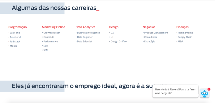 Famous companies using Revelo’s solution include QuintoAndar, Gympass, Itaú, 99 Taxis, as well as many others. Depending on the industry, common job placements include roles in the finance, marketing, data, design, business administration and engineering departments.