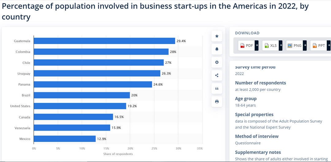 According to the study from StartupBlink, which analyzed startup ecosystems in a thousand countries, Colombia ranks at an impressive 40th place globally. This underscores the country’s favorable environment for establishing and growing new businesses and the appeal it holds for investors. This is further corroborated by data published by Statista, stating that 28% of the Colombian population is engaged in some activity or work related to startups.