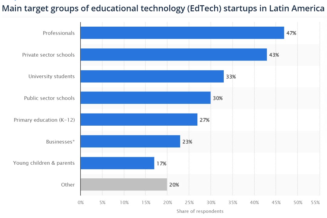 According to a 2022 survey by Statista, edtech startups in Latin America primarily focused their services on professionals looking to improve or acquire skills. That year, approximately half of the high-level executives surveyed indicated that their companies were oriented towards this segment. A little over 40% of these companies in the region offered solutions aimed at private schools, while 30% focused on meeting the needs of public schools.
