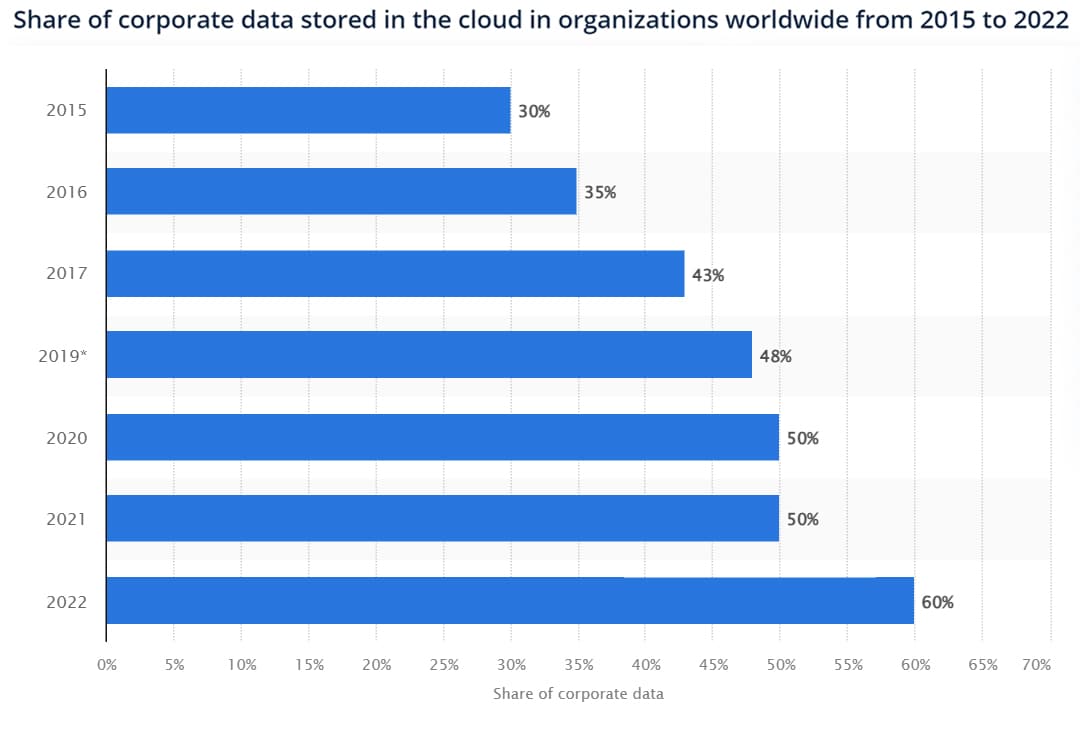 In recent years, there has been a notable increase in the amount of corporate data stored in the cloud, reaching 60% by 2022. This represents significant growth since 2015, when only about 30% of corporate data was held this way.